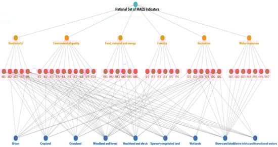 The Common International Classification of Ecosystem Services (CICES ver. 5.1) [59] was used to assign ES reported under the selected indicators, with the international and EU practice of reporting ES. The selected indicators are also assigned to the corresponding categories of ES indicators, proposed in the second MAES report [32], followed by the designation of the relevant terrestrial MAES level 2 ecosystem type (i.e., Urban, Cropland, Grassland, Woodland and forest, Heathland and shrub, Sparsely vegetated land, Wetlands, Rivers and Lakes).