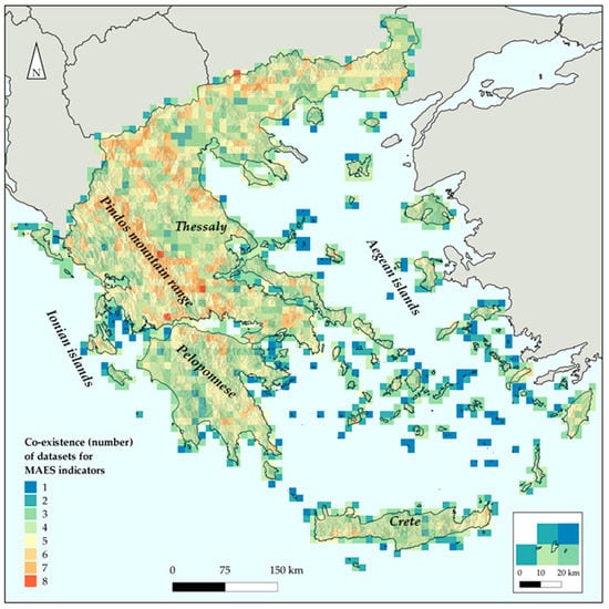 The thematic representation of co-existing MAES-related datasets, with spatial reference, at the 10 × 10 km EEA reference grid-cell level (Figure 4), highlights that the available, ready-for-use information follows a terrain-, relief-oriented pattern, as follows: (i) cells of mountain ranges, especially in the northern Peloponnese and further north, contain information from five or more of the available datasets (yellow to red colors), an area accounting for 751 out of 2215 cells (34% of the total extent). This is due to a lack of typical (timber-oriented) forest management and subsequently, to a lack of the relevant datasets, at the mountainous, forest and woodland areas of north-central Peloponnese and further south. (ii) Plain areas are dominated by cultivated land (designated by the “cropland area” dataset), e.g., western Peloponnese and Thessaly, and represent main agricultural areas of the country (dominated by greenish cells), (iii) island areas (Ionian Islands, Crete and Aegean Islands) are also dominated by cells of four or less MAES-related datasets. The distribution of the cumulative presence of MAES-related data in the grid cells throughout Greece is given in Table 4. These results pinpoint serious data gaps, since only twelve datasets are available to be directly used for the national scale assessment. The most complete and detailed datasets are those for cropland and forestry. The detailed information at each cell is provided in Supplementary Table S4.