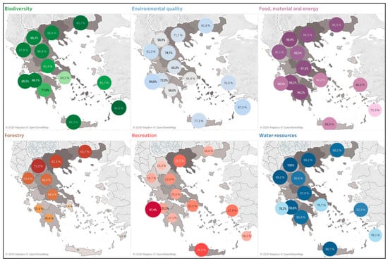 To pinpoint ES hotspot areas, as well as areas where multiple ES are likely to be supplied simultaneously (ES bundles) in space and/or time, thematic maps have been prepared, by depicting indicator-related data overlaps; by this, areas of ES importance (high to low) are identified and the relevant priority MAES maps (priority areas maps) have been drafted. To identify areas where multiple ES are simultaneously supplied (or potentially supplied) in spatial and/or temporal terms, we used spatial analysis, and layer-overlay techniques, at the 10 × 10 km EEA reference grid for Greece [63], using Geographic Information Systems; thus, we highlighted areas where ES bundles are present and further study is needed at a more detailed level (i.e., regional and local levels). This methodology is based on the following assumptions: (a) each indicator layer was considered as of equal importance and its presence in each grid cell is assigned to a binary value, i.e., 0: not present, 1: present, in cell, (b) summing all values from the overlaying layers in each cell, represents each cell’s importance for ES (higher values at cell represent higher importance and vice versa), (c) the available, spatial-referenced datasets were used for: (i) forest-management studies, (ii) wind-energy stations, (iii) hydroelectric-energy stations, (iv) solar-energy stations, (v) national forests, (vi) Natura 2000 areas and/or wildlife refuges, (vii) “blue flag” beaches, (viii) thermal springs, (ix) inland boating and rafting, (x) mountain shelters, (xi) cropland area and (xii) water resources, (d) these datasets were used as single or combined categorical variables, by recording their presence in each 10 × 10 EEA reference grid cell of Greece. By this, a matrix calculating the presence of the various datasets per grid cell has been created. The categorization of the total sum of the various datasets’ availability in each grid cell, using GIS software, resulted in a thematic ES bundles national map, based on MAES-related available datasets for Greece. To support MAES knowledge at the administrative, regional-management level, the representativity of ES bundles at the regional (NUTS 2) level has also been prepared and presented using the analytics and visualization Tableau online platform (ver. 2020.1) [64] for the six general groups (i.e., Biodiversity, Environmental quality, Food, material and energy, Forestry, Recreation, Water resources) of the proposed set of indicators. The area of each region is also integrated in the analysis in order to encapsulate the relative importance of each region regarding the potential ES provision.
