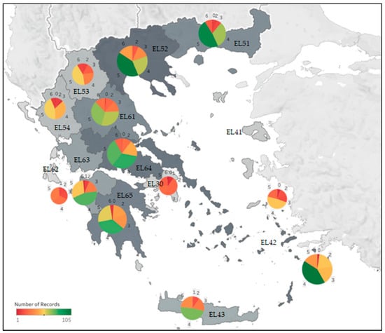 - Biodiversity: most administrative regions are covered by an adequate number of biodiversity-related datasets (their majority is rated above 80%). The regions of South Aegean, East Macedonia and Thrace and Crete are covered at highest rates (91.5%, 90.7% and 89.3%, respectively). The region of Attica, hosting the metropolitan center and capital of Greece—Athens, is in the last position of the classification, with 69.1% of its area covered by biodiversity-related datasets. Overall, area-size differentiations are not of significant importance.