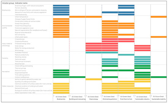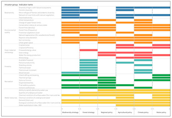 Indicator relevance with national strategies and polices (i.e., biodiversity strategy, forest strategy, regional policy, agricultural policy, climate policy and water policy) and with the EU “Green deal” set of transformative policies (i.e., clean energy, sustainable industry, building and renovating, sustainable mobility, biodiversity, “from farm to fork”, eliminating pollution) is also considered. A thematic representation of the indicators relevance (as approached in Section 2.1, iv) was drafted to initially assess the indicators’ potential use for implementing and evaluating various policies, across the Greek terrestrial territory.