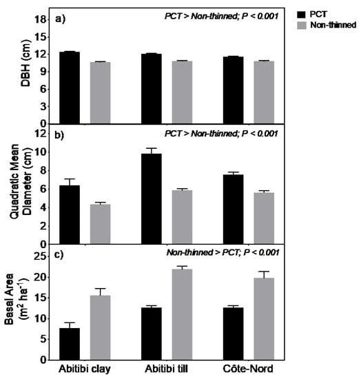 PCT had a significant (p < 0.001) effect on stand density. More specifically, stand density in PCT plots were 41%, 54%, and 35% lower than in control plots in the Abitibi clay, Abitibi till, and Côte-Nord sites, respectively (Table 1). Average tree height was significantly (p = 0.039) higher in Abitibi till (8.9 m) than in Côte-Nord (7.7 m), but not affected by PCT (Table 1). By contrast, there was no effect of site type on DBH or QMD, but average DBH and QMD across all site types was significantly (p < 0.001) higher in PCT than in control plots (Figure 1a,b). Total BA across site types was significantly (p < 0.001) lower in PCT than in control plots (Figure 1c).