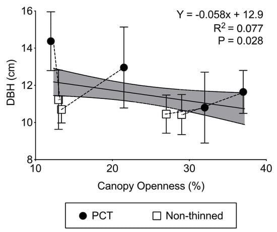 Results of linear regression analysis testing the relationship between canopy openness and mean diameter at breast height (DBH) in Abitibi clay plots. Only Abitibi clay plots are shown because differences in canopy openness values between PCT and control plots on the other two site-types varied by less than 2%. Solid circles and white squares represent the mean DBH (n = 8) of PCT and non-thinned plots, respectively, on each of 8 plots. PCT and non-thinned plots from the same site are linked by dashed lines. The linear regression model includes all 64 data points (see Supplementary Data File—S1). The grey shaded area represents the 95% confidence interval of the predicted regression slope. Vertical lines represent the standard error of DBH within sites.