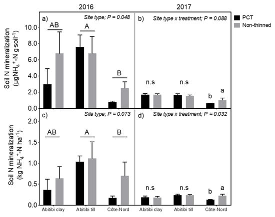 We found significant interactions between treatment, site-type, and sampling year on soil N mineralization data. For this reason, data from each sampling year were analyzed separately. In 2016, N mineralization rate per soil mass was significantly (p = 0.048) higher in Abitibi till than in Côte-Nord (Figure 3a). A similar trend (p = 0.073) was found in 2016 when N mineralization was calculated on a land surface area basis (Figure 3c). In 2017, we found a near significant (p = 0.088) treatment × site type interaction on N mineralization rate per soil mass, and a significant (p = 0.032) treatment × site type interaction on N mineralization rate per land surface area. On both a soil mass and land surface area basis, N mineralization rates in Côte-Nord were significantly (p = 0.046 and p = 0.023, respectively) lower in PCT than in control plots, whereas PCT had no effect on N mineralization rates in the other site types (Figure 3b,d).
