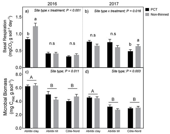 In both sampling years, there were significant (p < 0.001 in 2016; p = 0.016 in 2017) PCT × site type interactions on microbial basal respiration (Figure 4a,b). More specifically, basal respiration in 2016 was significantly (p = 0.002) lower in PCT than in control plots within Abitibi clay sites; a similar effect (p = 0.030) was found in 2017 within Côte-Nord sites. In both sampling years, soil microbial biomass was significantly (p = 0.011 in 2016; p = 0.003 in 2017) higher in Abitibi clay than in the other two site types (Figure 4c,d).