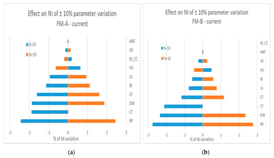 Results of the sensitivity analysis testing a variation of 10% of the parameter value on the current assessment: CF: closed forests; ANT: anthropization; W_CC: humid area in clearcut; CT: cover type; LS: late successional species; OF: old forests; IR: irregular stands; HS: horizontal structure; DW: dead wood; RP: regeneration process. (a) FM-A, (b) FM-B.