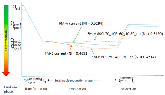 Using the registry’s reference data set [21], the naturalness of the two territories are closer (FM-A: NIr = 0.4683; FM-B: NIr = 0.4349) (Figure 4) and are both lying in the semi-natural range. The main disparities between the two data sets values are for OF and IR (Table A1) especially for FM-A, leading to a much lower PNI_Struc with the registry’s values. The difference related to coniferous cover type between the two data set is not reflected in the model, because of the use of topped curve for CT above the historical value.