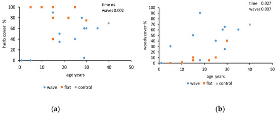 (a) Herb and (b) woody cover in postmining sites of various ages that were either levelled (flat) or not (wave). Control was forest unaffected by mining; p values shown for effect of plot age (time) and presence of wavy surfaces (waves).