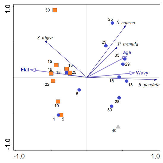 The development of vegetation cover with site age was different between graded sites and sites where the original wavelike surface was maintained. In flat graded areas, there was significantly greater herb cover (Figure 2a). Moreover, percentage herb cover in these sites was already high during the initial stages and slightly decreased with site age. Most of the herb layer in all sites was formed by the Calamagrostis epigejos grass. In contrast, no herb cover was present during initial stages in wavy sites and increased with time. Consequently, the difference in herb cover between flat and wavy sites decreased in the older, later stages of succession. Woody cover (Figure 2b) was significantly higher in wavy areas than that in levelled sites in all stages of succession. In flat areas, woody cover increased slowly in the last stages, whereas in wavy areas, the increment started during the younger phases and, in the 20-year-old site, it reached 60%–80% cover. The most abundant woody vegetation in flat areas was elder (Sambucus nigra) and roses (Rosa canina). Woody vegetation in wavy sites was dominated by birch (Betula pendula), with Salix caprea and Populus tremula being common (Table S2). PCA showed distinct differences in the composition of dominant woody species between flat, levelled, and unlevelled sites that kept a wavy appearance (Figure 3). This was supported by a significant difference in the position of wavy and flat sites along the first ordination axis (p < 0.01, t-test). In a similar manner as woody and herb covers behave, woody and herb litters also do, which differ in development over time with regard to wavy and flat sites (Table S1).