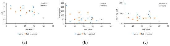 Chemical factors: (a) pH, (b) available phosphorus, and (c) sodium in postmining sites of various ages that were either levelled (flat) or not (wave). Control was a forest unaffected by mining; p values shown for effect of plot age (time) and presence of wavy surfaces (waves).