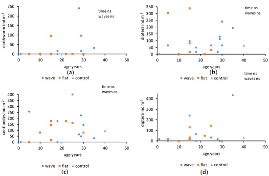 (a) Earthworms, (b) dipterans, (c) centipedes, and (d) millipedes in postmining sites of various ages which were either levelled (flat) or not (wave). Control was a forest unaffected by mining; p values shown for effect of plot age (time) and presence of wavy surfaces (waves).