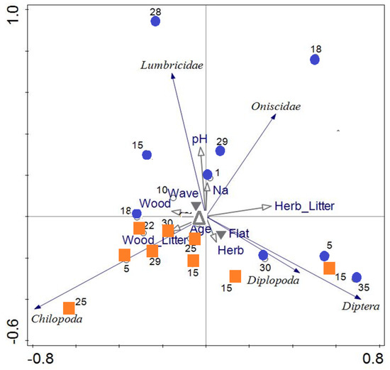 None of the soil fauna groups was significantly affected by either age or surface levelling (Figure 5). In most groups, populations in wavy ungraded sites showed a tendency to increase over time, while in graded sites, maximal abundance was found in sites of early or middle age. Different parameters between flat and wavy areas were identified by PCA (Figure 6) when age and type of substrate were considered together. There was a clear distinction between levelled and wavy sites, but no clear effect over time, as supported by a significant difference between the position of flat and wavy sites along the second ordination axis (Figure 6; p < 0.05, t-test). Earthworms (Lumbricidae) and terrestrial isopods (Oniscidea) tended to be more abundant in wavy sites, while millipedes (Diplopoda), fly larvae (Diptera), and centipedes (Chilopoda) were found in greater densities in levelled sites. Considering the species composition of dominant groups (Table S3), four species of earthworm were found. Endogenic Aporectodea calliginosa dominated among earthworms. Two eurytopic species of isopods, Trachelipus rathkii and Armadillidium vulgare, were found. Ten species of millipedes dominated by Polyzonium germanicum and Megaphyllum unilineatum, and eight species of centipedes, dominated by Lithobius microps and Schendyla nemorensis, were found.