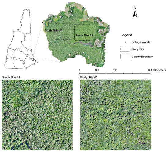 This research took place within the College Woods Natural Area (CWNA, Figure 1), 70°56′51.339″ W and 43°8′7.935′ N, in Durham, NH, USA. The CWNA is owned and managed by the University of New Hampshire. The annual average precipitation for the region is 119.38 cm with a yearly average temperature of 8.84 °C. Two soil types, Buxton and Hollis–Charlton, dominate this area. White pine (Pinus strobus), eastern hemlock (Tsuga canadensis), American beech (Fagus grandifolia), and several species of oak (Quercus spp.) are the primary tree species/genera. Two study sites, each covering a 400 × 400 m area, were chosen within the CWNA. Both study sites are a mixed forest type; however, the coniferous tree species are most prevalent in study site #1, while the deciduous tree species are dominant in study site #2.