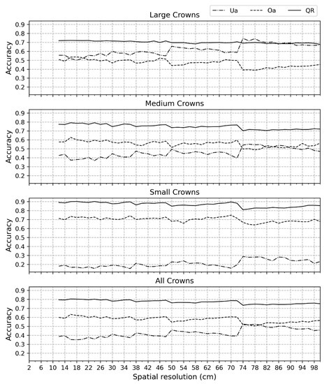 - The lines of Oa and Ua for medium crowns intertwine, and the gap between them becomes narrower in contrast to the one in the large group. It results in a stable QR around 0.60. The lowest QR appears when spatial resolution is 54 cm.