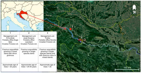 Narrow-leaved ash (Fraxinus angustifolia Vahl) is a species of great ecological and economical value in lowland and riparian forests of central Europe, the Pannonian Basin, and the Balkans [], as well as in Croatia where it grows in single-species or mixed stands as the second most abundant floodplain tree species after pedunculate oak (Quercus robur L.), with growth stock of 17,619,000 m3 (3.19% of total stock), occupying 72,690 ha (3.06% of total forest area) []. In these habitats, this ash is significant as a pioneer tree species, being able to outstand longer flood periods and grow in areas unfavorable for pedunculate oak. It is thus concerning that narrow-leaved ash has been one of the most damaged forest tree species in Croatia since 2014, when the number of trees with crown defoliation greater than 25% increased rapidly in comparison with previous years and reached 75% of trees in 2017 [].