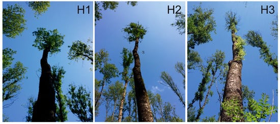 Research was conducted in lowland forests at the Sava river basin, where narrow-leaved ash occurs naturally and occupies the largest continuous forest area (28,000 ha) in Croatia [], and where H. fraxineus was confirmed in crowns of declining trees in 2015 [,]. Sampling was carried out in the period from April to September 2016 in narrow-leaved ash forest stands (both single-species stands and mixed with Quercus robur and Alnus glutinosa) exhibiting symptoms of ash dieback (increased crown transparency and tree mortality), located in the area of three forest management units, namely Črnovščak (45°45′ N, 16°18′ E), Josip Kozarac (45°23′ N, 16°48′ E), and Trstika (45°18′ N, 16°55′ E) (Figure 1). Trees selected for sampling were categorized in three health groups according to crown defoliation (H1 = crown defoliation ≤ 25%; H2 = crown defoliation 26–60%; H3 = crown defoliation 61–99%), which was assessed in accordance with the methodology of the International Co-operative Programme on Assessment and Monitoring of Air Pollution Effects on Forests, known as ICP-Forests (Figure 2) []. Dead trees with 100% crown defoliation were not considered in this research. In each health category, 30 trees were randomly chosen for sampling. The average diameter at breast height (DBH) of selected trees was 21.29 cm (SD = 6.51 cm). Differences between average DBH of trees among categories were not statistically significant (F (2, 87) = 0.34, p = 0.71).