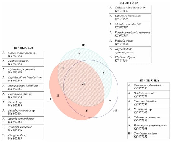 Trees classified into health category H1 yielded 281 fungal cultures belonging to 47 different taxa (3–11 per tree), trees in category H2 gave growth to 312 isolates appointed to 44 taxa (2–9 per tree), and trees in category H3 resulted in growth of 314 fungal mycelia corresponding to 45 taxa (1–9 per tree). Trees from all health categories shared 25 common taxa, while another 25 taxa were found in just one (Figure 3). Sørensen similarity indices between categories were moderate to high (H1 vs. H2 = 0.659; H1 vs. H3 = 0.673; H2 vs. H3 = 0.719). The most frequent taxon on trees from category H1 was Ilyonectria robusta, followed by Trichoderma spp. and Cladosporium cladosporioides. Trees in categories H2 and H3 shared the three most frequent taxa, with the most present being Trichoderma spp., followed by Ilyonectria robusta and Fusarium solani.
