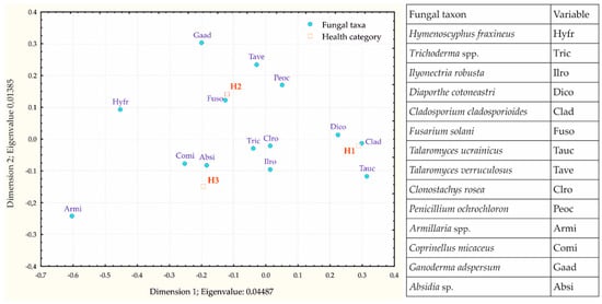 Association of the 13 most frequent taxa and Hymenoscyphus fraxineus with different health categories was explored using correspondence analysis and is shown in Figure 4. Chi-squared testing revealed that differences between the observed and the expected frequencies were not statistically significant (total chi-squared = 21.49; df = 26; p = 0.7162). Dimensions 1 and 2 explained 76.42% and 23.58% of the inertia, respectively. The correspondence analysis map revealed that healthy trees in category H1 were most associated with Cladosporium cladosporioides, declining trees in category H2 with Fusarium solani, and most affected trees in category H3 with Coprinellus micaceus and Absidia sp. Out of 14 fungal taxa taken in consideration for correspondence analysis, only Hymenoscyphus fraxineus and Armillaria spp. were found exclusively in symptomatic wood tissues in both roots and stem bases, while other fungi colonized both visually healthy and symptomatic wood tissue.