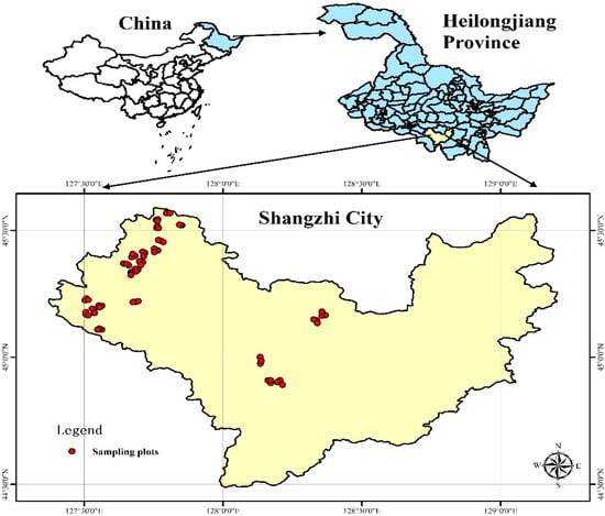 Geographical position of study area and the sampling plots in the Shangzhi city of the Heilongjiang Province.
