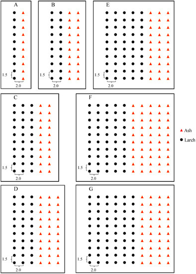 The framework of different planting designs for the mixed-species ash and larch plantations in the study site, (A) for 1:1, (B) for 2:2, (C) for 3:2, (D) for 3:3, (E) for 5:3, (F) for 5:5, and (G) for 6:4.