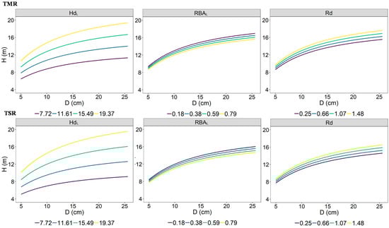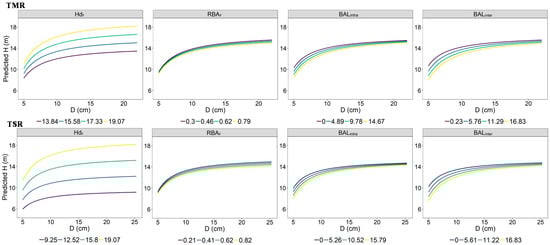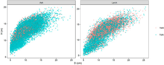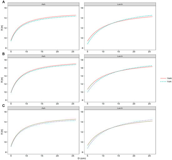 Based on the GHDR models’ formula, the effects of (TMR and TSR) on the H–D relationship for larch and ash were simulated at the average values of other predictors with three random sampled plots (Figure 5). The GHDR model results showed that there was a significant difference in H between TMR and TSR for both species. The H of TMR was found to be higher than those of TSR for both ash and larch. However, it is worth noting that for larch, the H of TMR was higher in the early growth period, but then the difference decreased with time, before finally being lower than the H of TSR.