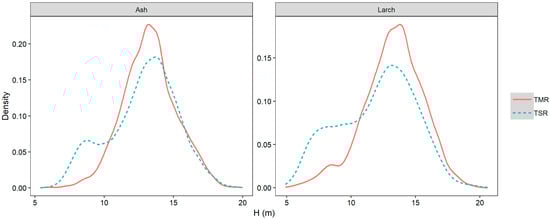 The probability density plots of the two species were used to analyze the distribution of H across different statuses (TMR and TSR, Figure 4). Preliminary visual inspection showed that the two species’ heights were obviously different across both TMR and TSR, in which, the data centered on different values. As the non-normality (p < 0.01) of H in different rows of two species showed in Figure 4, a nonparametric test (Mann-Whitney test [66]) was applied to compare whether the value of the average height of TMR and TSR were significantly different between larch and ash. The result of the two-way Mann-Whitney test supported that the average height of TMR and TSR were significantly different (p < 0.01). However, limited evidence confirmed the different height of TMR and TSR by the data collected so far; hence, it was also necessary to use a modeling method for further analysis and verification.