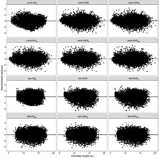 where and are the random parameters, while the other symbols are defined above. The parameter estimates, variances, and fit statistics for all H–D models are listed in Table 4 and Table 5. The scatterplots between the standardized residuals and the estimated height by utilizing weighted regression are shown in Figure 6. Within the sampled plot, heteroscedasticity in the residuals was reduced by applying a weighted regression in the form of a power function, at the base of the predicted height. The values of the power variance functions are also listed in Table 4 and Table 5.