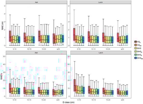 The residuals of the six models were plotted across four D classes (Figure 9). The average values of MAE and MAE% were relatively stable in all D classes and six models, except the HDB models for both small size (5 < D < 10 cm) ash and larch, which indicated a stable prediction accuracy within the range of D. This could improve the prediction accuracy by applying both the join of covariates and NLME modeling approach for larch and ash. Compared to the ordinary least square, the NLME method showed a significant improvement from the perspective of MAE and MAE%.