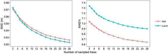 The prediction performance of the GHDRM model for each species with different numbers of prior measured trees are shown in Figure 10. The value of MAE and MAE% were decreased with increasing numbers of sampled trees, which implicated that the prediction accuracy increased when more prior height information was used to calculate the random effect parameters. There was no significant difference between six, seven, or even more sampled trees, based on the significant test of MAE and MAE% in the different numbers of previously measured trees.