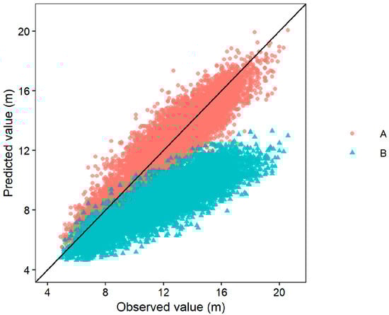 Comparison of H predictions for the developed H–D model of larch in (A) this study and (B) the H–D equations for larch plantations of Zang et al. [32].