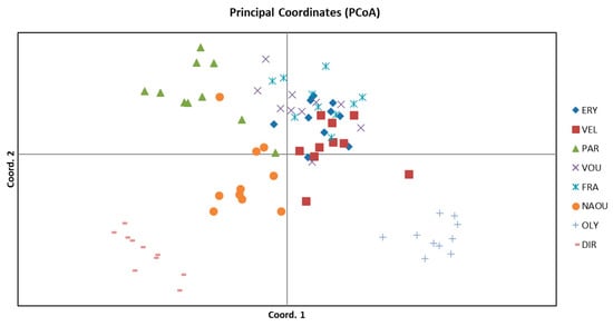Analysis of Molecular Variance (AMOVA) and Principal Coordinates Analysis (PCoA) were performed with Genalex 6.5. For PCoA, the method for dominant data by Huff et al. [] was followed. The test of significance for the AMOVA was carried out on 9999 permutations of the data.
