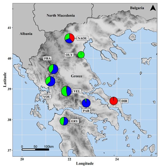The ΔK statistic in the STRUCTURE analysis presented a maximum peak at K = 3 (Figure S1), suggesting that three different genetic clusters exist. The individuals from Olympos and Dirfi were categorised into their own unique clusters, while most of the individuals from Parnassos formed a third one. The individuals from the remaining populations were assigned to Parnassos’ and Olympos’ genetic clusters, except those from Naousa which were assigned to all three existing clusters (Figure 2).
