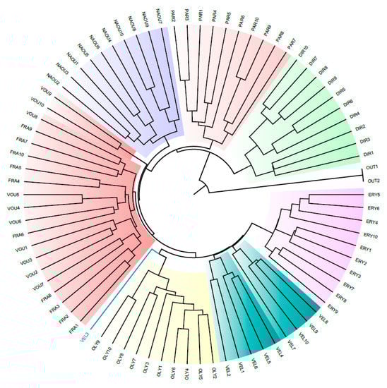 The topology obtained is in concordance with the grouping deduced by the 1st coordinate of PCoA and follows the pattern of diversity clustering revealed by the STRUCTURE analysis.