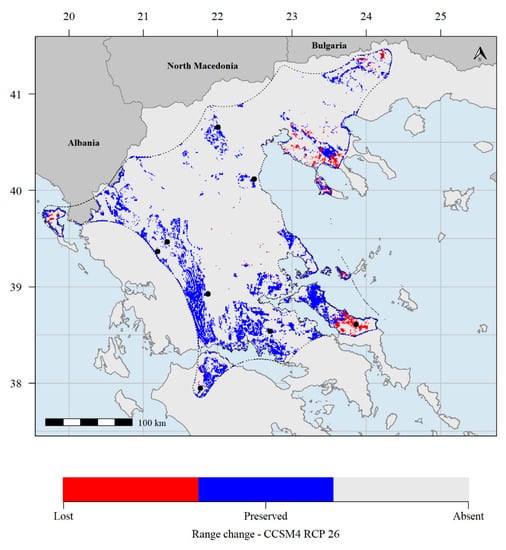 Contemporary climate change is influencing species distribution and population structure, with important consequences for patterns of genetic diversity and species’ evolutionary potential []. The climatic factors (MAT, PETWQ and MDR) emerged as the most significant variables in shaping the species’ distribution and its genetic diversity turnover. Our analyses were robust and bioclimatically consistent (Figures S2–S6), for every source of uncertainty. We were able to discern the physiological threshold above which the species’ local adaptation and genetic make-up seems to change drastically (Figure S18) and is responsible for the differences in within and among population genetic diversity observed in the northern and southern populations of Helleborus odorus subsp. cyclophyllus. It is very likely that the species is going to experience a moderate to severe decline in its distribution under any GCM/RCP/climate database combination (Figure 4 and Figures S7–S17). These changes will probably be more pronounced in the species’ southern and NE range edge in Greece (Figure 4 and Figures S7–S17). The Pindos mountain range seems to buffer the climate change effects and will probably continue to host several populations of H. odorus subsp. cyclophyllus.