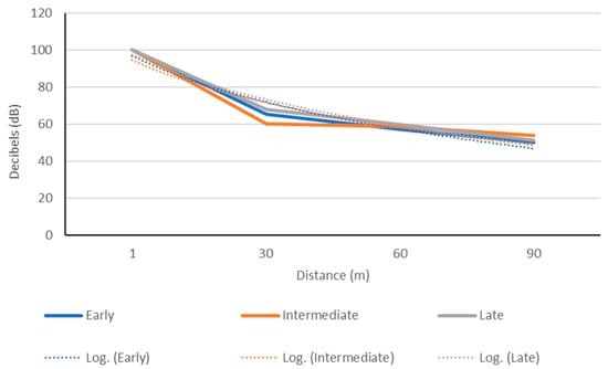 The SPL from the playback decreased as the distance increased from the sound source, following the inverse distance law equation []: (Excess)SPL = (SPL1 − SPLi) − [20 × Log 10 (di/1)], where SPL1 is the SPL of the playback measured at 1 m used as a reference value, SPLi is the SPL recorded and measured at four distances from the sound source (i.e., 30 m, 60 m, and 90 m), and d is the distance in meters to the sound source (Figure 2). The sound attenuation showed a similar pattern for the three forest age classes, having close SPL values at 90 m that ranged from 50.1–53.9 dB. Based on these observations and in results from an initial test, ARUs are not able to collect sounds from birds calling at a 120-m radius in TDFs of the age classes analyzed. Since sound attenuation is similar among age classes, the probability of recording sounds from a bird is the same for the different classes. Lastly, ARUs should be deployed at least 120 m apart from each other to avoid recording the sounds from the same individual bird.