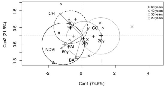 Linear Discriminant Analysis (LDA) for the different forest age classes (i.e., 20, 30, 40, and 60 years old) and forest structural characteristics (tree basal area: BA; percentage of canopy openness; CO; plant area index (PAI); canopy height: CH; and Normalized Difference Vegetation Index: NDVI). Axis 1 (Can1) explains 74.5% of the variance and Axis 2 (Can2) explains 21.5%.