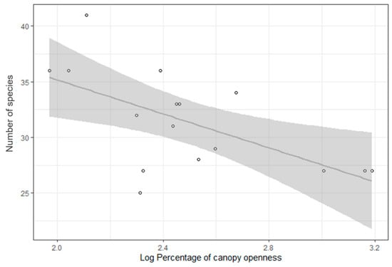 Percentage of canopy openness (log) explaining variation in bird species richness. Confidence intervals at 95% shaded area, R2 = 0.38.