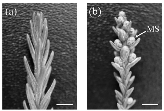 Morphology of the shoot top of Cryptomeria japonica: (a) nontreated control sample at 6 weeks (CT_6 w); (b) GA3-treated sample at 6 weeks (GA_6 w). Male strobili (MS; indicated by arrow) are formed at the axil of the shoot.