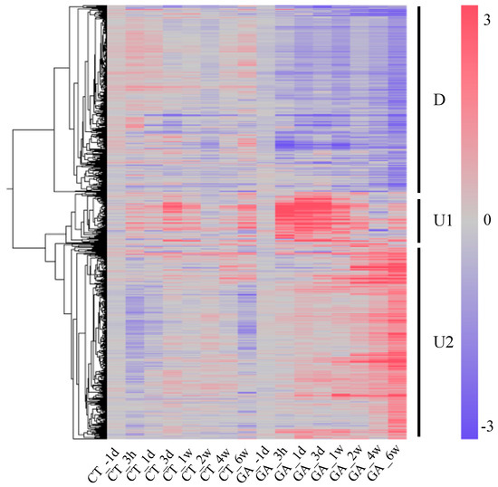 Tree clustering analysis of 881 DEGs. D, U1, and U2 on the right indicate three different clusters of differentially expressed genes (DEGs) used for further analysis. CT_−1 d, CT_3 h, CT_1 d, CT_3 d, CT_1 w, CT_2 w, CT_4 w, CT_6 w, GA_−1 d, GA_3 h, GA_1 d, GA_3 d, GA_1 w, GA_2 w, GA_4 w, and GA_6 w are sample names.