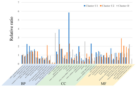Gene ontology (GO) categories of DEGs that encoded proteins with sequence similarity (E-value <1E−5) to proteins in the TAIR database. The longitudinal axis shows the relative ratio of the genes of Cluster U1 (blue), U2 (orange), and D (gray) against GO analysis results for all genes on the custom microarray (GEO accession: GPL21366). BP: biological process, CC: cellular component, MF: molecular function.