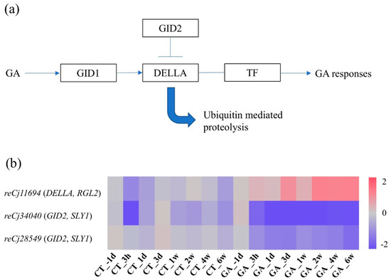 Genes that had sequence similarity with GA signal transduction-related genes were detected among the DEGs. A DELLA-like gene (reCj11694) was upregulated by GA3 treatment, whereas SLY1-like genes (reCj34040 and reCj28549) were downregulated by GA3 treatment (Figure 4). Detailed research on the molecular mechanism of GA signal transduction has been carried out in model plants like Oryza sativa and A. thaliana. In those systems, GAs bind to the GA receptor (GID1), enabling GID1 to interact with DELLA repressor proteins, which are negative regulators of GA signaling [44,45,46]. DELLA interacts with transcription factors, either impairing transcription factor function (by inhibiting factor ability to bind DNA) or enhancing DNA binding (by acting as a transcriptional coactivator) [47,48,49,50]. These GA-induced GID1-DELLA interactions lead to the degradation of DELLA repressors through the Skp, Cullin, F-box complex [3,46,51]. Concordantly with the results found in the present study, the upregulation of DELLA-like genes in response to GA treatment has been reported in grape and jatropha, suggesting the possibility that the upregulation of DELLA is the result of feedback regulation via GA signaling [52,53]. Regulation by a GA feedback mechanism may be also able to apply in C. japonica. Validation of this hypothesis will require further analysis, including determination of quantitative changes of DELLA protein levels in response to GA treatment.