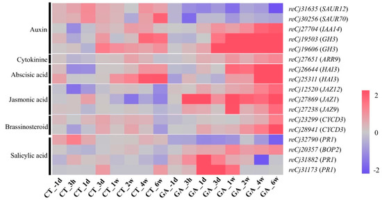 The heat map analysis associated with plant hormone signal transduction pathways without GA. The relative expression values were log2 transformed. Red indicates high expression; blue indicates low expression. CT_−1 d, CT_3 h, CT_1 d, CT_3 d, CT_1 w, CT_2 w, CT_4 w, CT_6 w, GA_−1 d, GA_3 h, GA_1 d, GA_3 d, GA_1 w, GA_2 w, GA_4 w, and GA_6 w are sample names. Details of these genes are provided in Table 1.