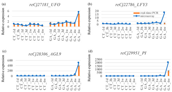 Real-time PCR validation of DEGs data. Bar graphs show relative expression from real-time PCR and line graphs show raw data signals from microarray analysis. Data are presented as mean + standard deviation (n = 3). (a) reCj27181_UFO, (b) reCj22786_LFY3, (c) reCj28306_AGL9, (d) reCj29951_PI. CT_−1 d, CT_3 h, CT_1 d, CT_3 d, CT_1 w, CT_2 w, CT_4 w, CT_6 w, GA_−1 d, GA_3 h, GA_1 d, GA_3 d, GA_1 w, GA_2 w, GA_4 w, and GA_6 w are sample names.