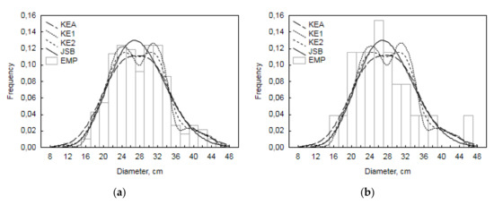 An example of diameter distribution modeling by the nonparametric method represented by KE1, KE2, KEA, and the parametric method based on JSB function is shown in Figure 1. The frequency of diameters belonging to the training set (Figure 1a), which was used for model development, was very well fitted by KE1. The application of KEA led to a much more general model that does not consider local maxima and minima in diameter frequency, which were observed in sample distribution. The parametric model based on JSB function is also a more general model. The comparison of estimated models for an independent data—the test set (Figure 1b)—showed the advantage of general models reflecting the rough shape of distribution over models that excessively fit the shape of the empirical distribution from the sample used for estimation.