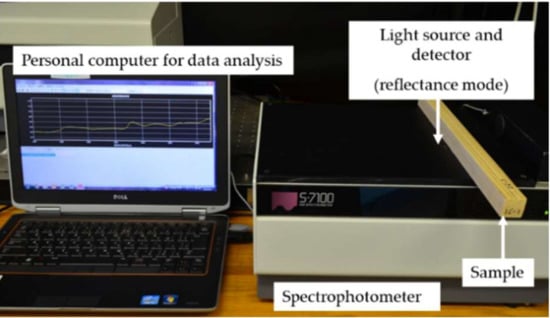 The NIR measurement device and the position of light source and detector (sample holder) are shown in Figure 1. The measurable range of the NIR device (S-7100; Soma Optics, Ltd., Tokyo, Japan) was from 1200 nm to 2500 nm. The resolution of the spectroscope was 1 nm. As the samples were irradiated with monochromatic light, the reflectance spectra were obtained. The number of scans was 5.