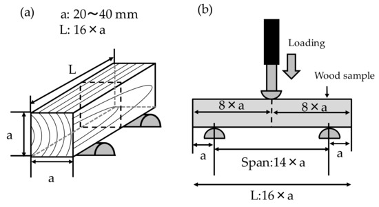 Cryptomeria japonicaD. Don (obtained from a commercial Japanese lumber mill; located at Fujisawa City, Kanagawa Pref.) was prepared and cut into a final size of 20 mm × 20 mm × 320 mm after wood drying. Its size was suitable for the Japanese industrial standards (JIS) standard with the bending test (Figure 2a). The central concentrated load method was used for bending test (see Figure 2b). The total number of analyzed wood samples was 140. In the log-bucking method, the rift-cutting wood sample was selected as frequently as possible. The sample’s length was oriented in the longitudinal direction, and the measurements were performed at room temperature.