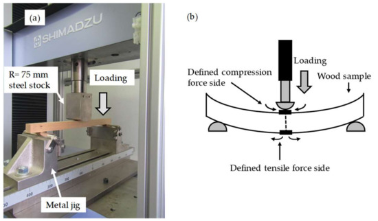 where Pmax (N) is the value of the applied load at failure. These values were obtained by using a precision universal testing machine (AG-X plus 50 kN; Shimadzu, Tokyo, Japan). Both Equations are widely used in the wood science field to calculate bending strength. Figure 3a shows displays the setup for the universal machine, where a compression test, tensile test, bending test, etc., can be performed by changing the metal jig. The loading force of the wood sample and the wood deformation due to load were recorded until the wood failed. Figure 3b illustrates both the load and force directions inside the wood as a result of the bending test. Two forces occurred on the wood’s surface due to the bending load. The loading surface on the wood was defined as the compression force side. The opposite side was defined as the tensile side. The load speed was 14.7 N/mm2 per minute. R = 75 mm steel stock was used as the load point. The DEN was estimated by the division of sample’s weight and volume, which was measured by multiplying length and cross-sectional area.
