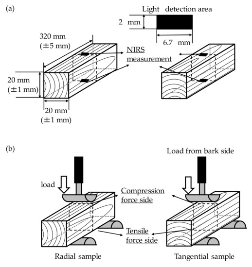 Illustration of (a) near-infrared spectroscopy (NIRS) measurement position and (b) loading direction of the wood sample.