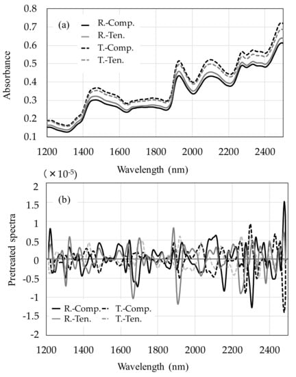 Near-infrared spectra of Cryptomeria japonica from the radial section; the tensile section from the compression side and the tensile side, (a) the raw spectra and (b) the pretreated spectra. R—radial sample; T—tangential sample; Comp.—compression surface; Ten.—tensile surface.