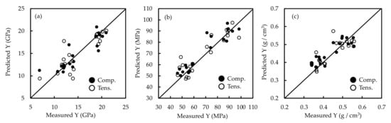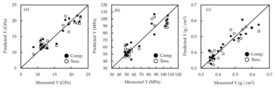 Figure 7 shows the relationships between the measured value and the NIR-predicted values for each of the physical properties resulting from the pretreated spectra when loading the tangential section. While the compression data appear near the target line, the tensile data are slightly off the target line. To date, the accuracy of wood density prediction has been worse than other mechanical property values. This result tendency was consistent with the result of other researchers [,].